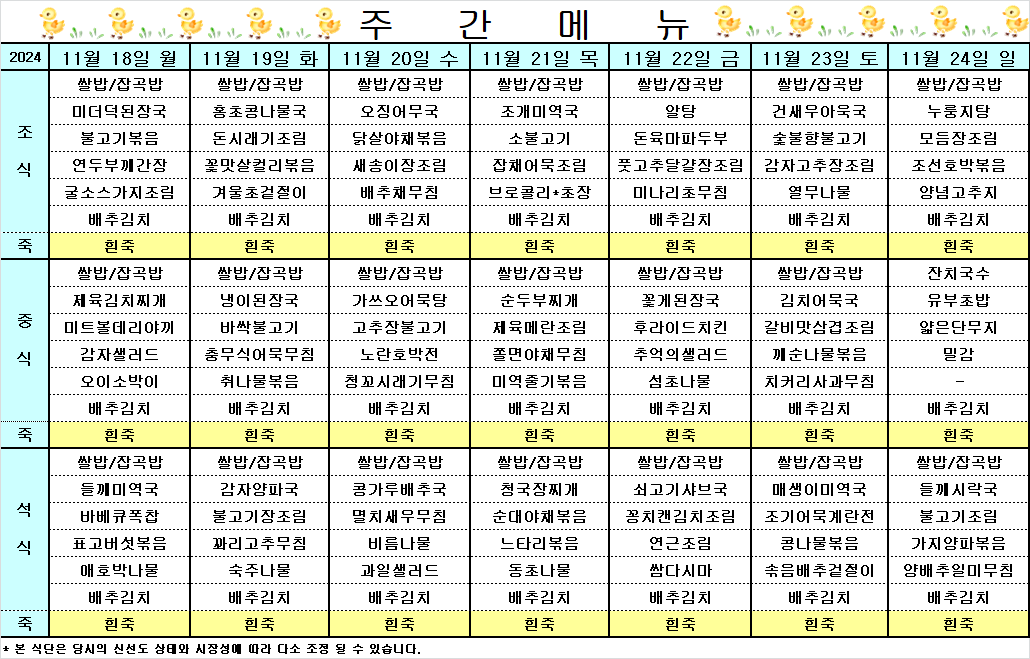 I HOME > 커뮤니티 > 건강식단 건강식단 2024.11.18 ~ 2024.11.24 식단표 작성자 운영자 작성일 2024-11-18 17:05 조회 469 좋아요 0 싫어요 0 인쇄 « 2024.11.11 ~ 2024.11.17 식단표 2024.11.25 ~ 2024.12.01 식단표 » 목록보기 2020-11-10