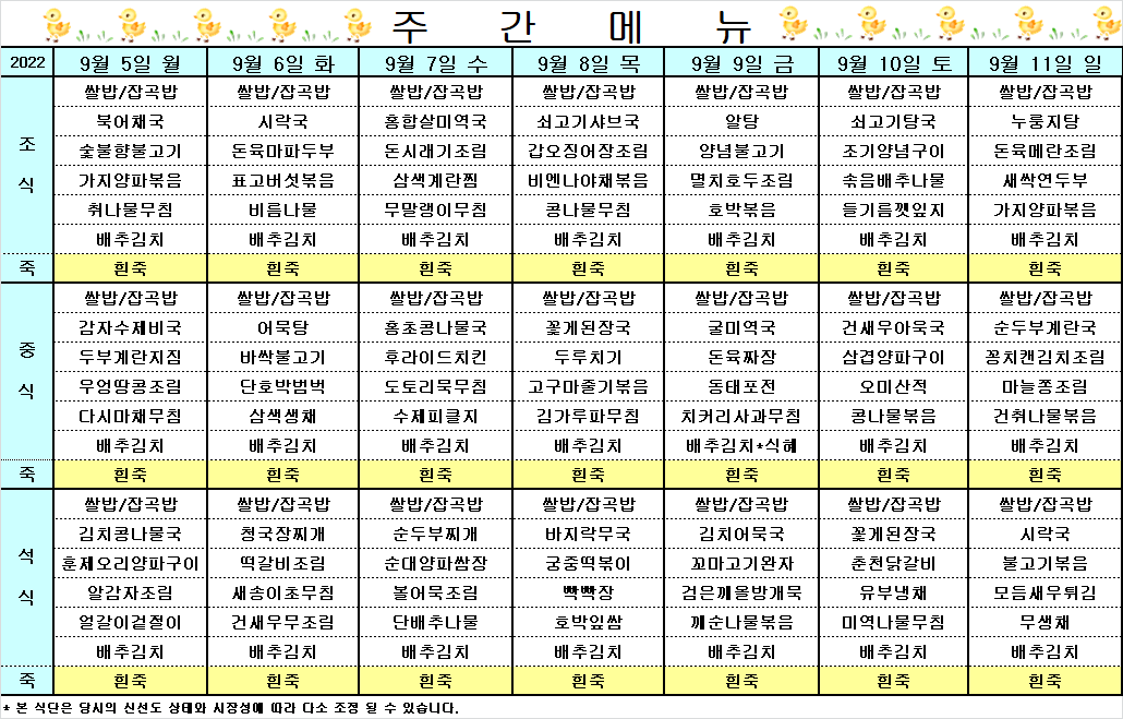 I HOME > 커뮤니티 > 건강식단 건강식단 2022.09.05 ~ 2022.09.11 식단표 작성자 운영자 작성일 2022-09-05 09:28 조회 1169 좋아요 0 싫어요 0 인쇄 « 2022.08.29~2022.09.04 식단표 2022.09.12~2022.09.18 식단표 » 목록보기 2020-11-10