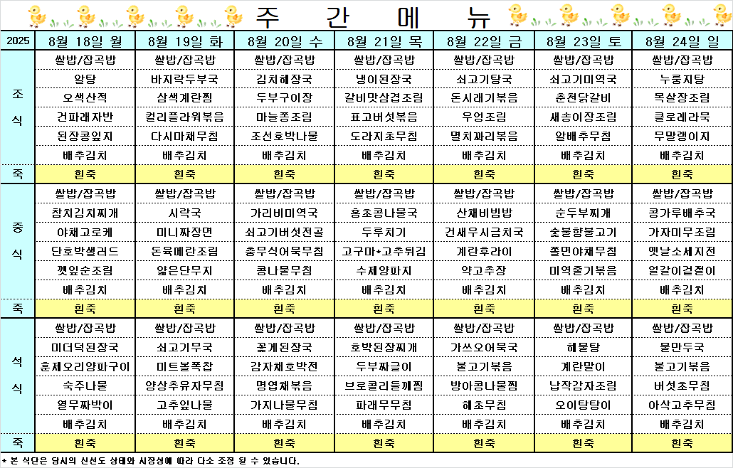 I HOME > 커뮤니티 > 건강식단 건강식단 2025.08.18 ~ 2025.08.24 식단표 작성자 운영자 작성일 2025-08-18 09:31 조회 181 좋아요 0 싫어요 0 인쇄 « 2025.08.11 ~ 2025.08.17 식단표 2025.08.25 ~ 2025.08.31 식단표 » 목록보기 2020-11-10